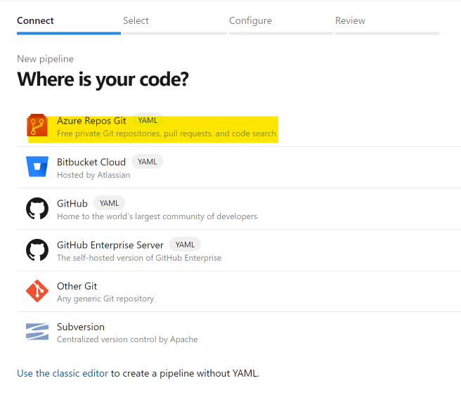 利用するリポジトリを選択する(今回はAzure Repos Gitを選択)。ここで旧来のUIを使ってパイプラインを作成したい場合(YAMLベースでない形で作りたい場合)は、Use the classic editorをクリックする。
