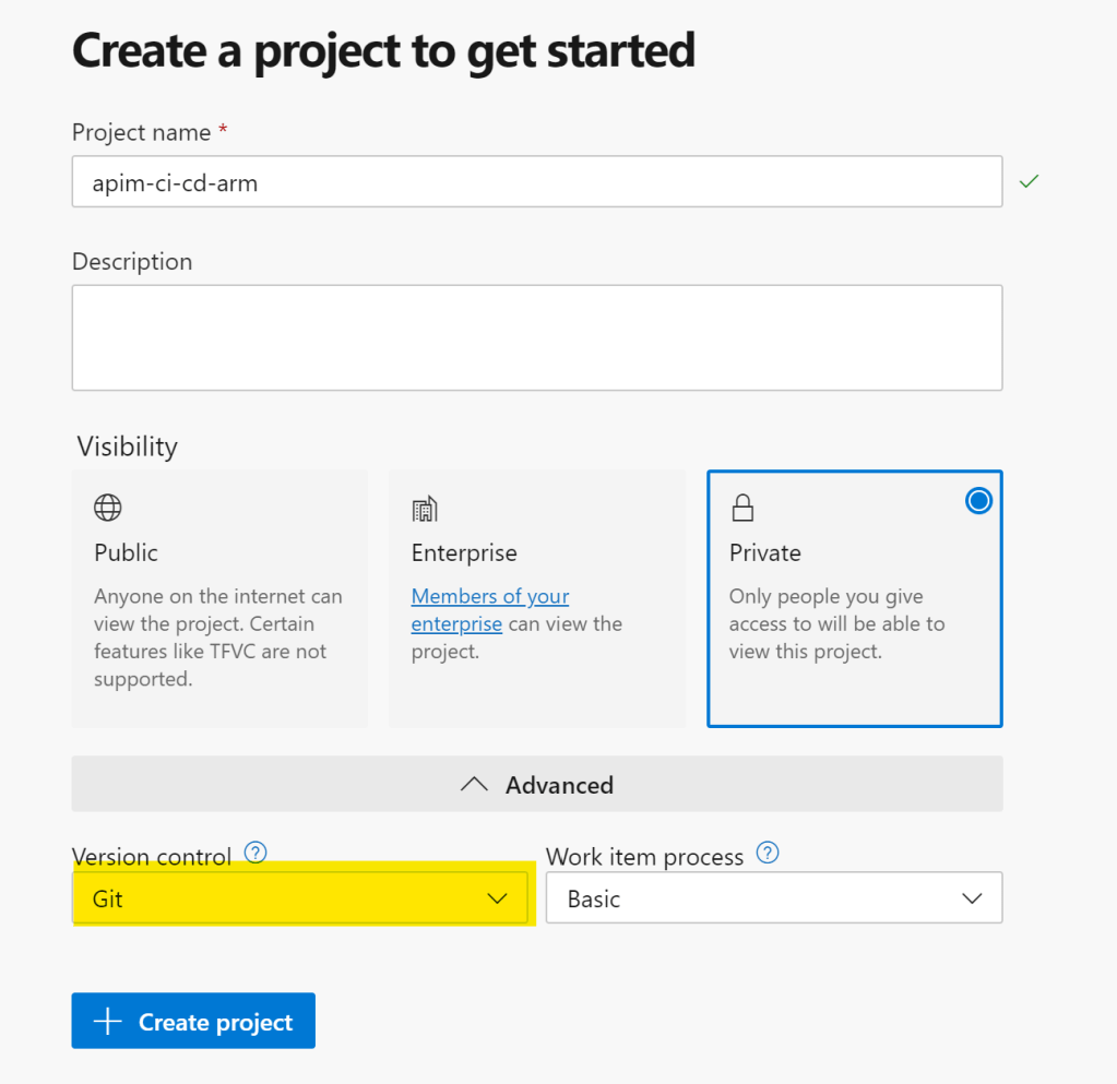 プロジェクト名を指定する。今回は apim-ci-cd-arm とする。バージョン管理はGitを選択。Visibilityはどれでも可。設定が終われば、【Create project】をクリック。