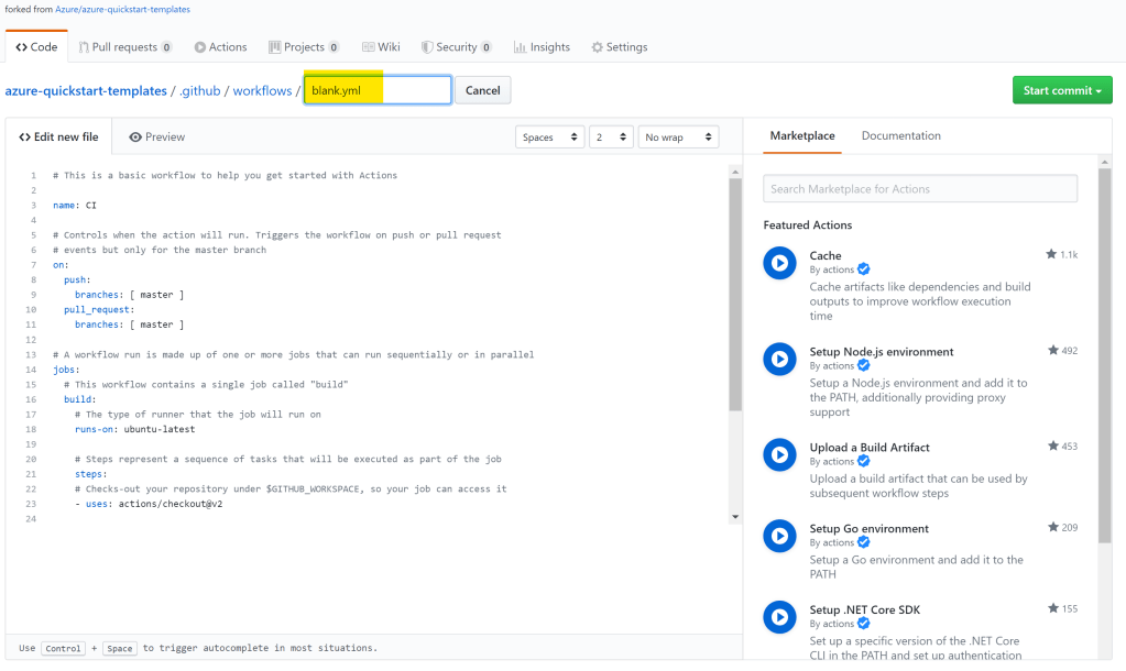 YAMLファイルの名前を指定する。今回はcreate-api-management-instance.ymlとしておく。作成したものはリポジトリの.github/workflowsに格納される。