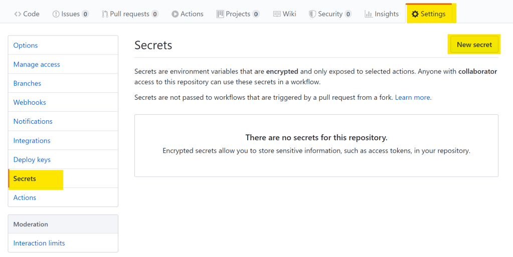 リポジトリのSettingsタブを選択し、現れる画面左側のメニューからSecretsを選択し、New secretをクリック。