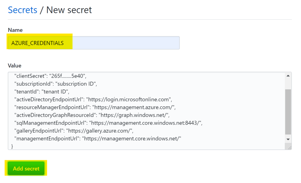 シークレットとして、先ほど取得したJSONを貼り付ける。シークレット名は今回はAZURE_CREDENTIALSとしておく。【Add secret】をクリックしてシークレットを保存する。シークレットは後から編集できない(上書きのみ可能)。