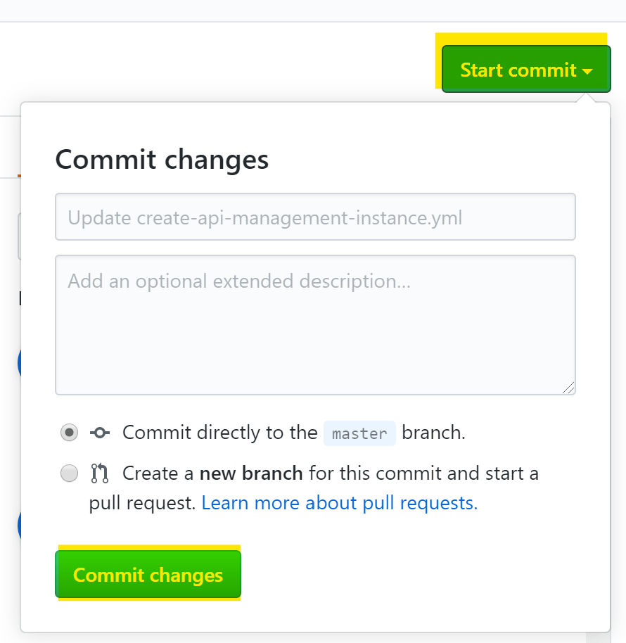 ここまで出来れば、あとはCommitしてテストするだけ。【Start commit】をクリックしてコメントを記載し、【Commit changes】をクリックする。するとワークフローが開始する。