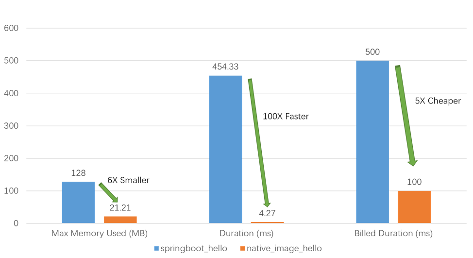 静的コンパイルしたMicronautベースのアプリケーションもAlibaba Cloudのfunction computingプラットフォームで実行しました。その結果も魅力的です。native_image_helloは静的コンパイルされたアプリケーションで、springboot_helloは同じアプリケーションではありますがJARとしてデプロイされ、これまでのJavaランタイム上で動作します。下図に結果を示しますが、native_image_helloはspringboot_helloに比べて起動時間で1/100、メモリ使用量で1/6で、80%コストを節約できます(billed durationは利用者がクラウドプラットフォーム上で課金される時間)。これらの2個のアプリケーションのレスポンス時間はほぼ同じです。
