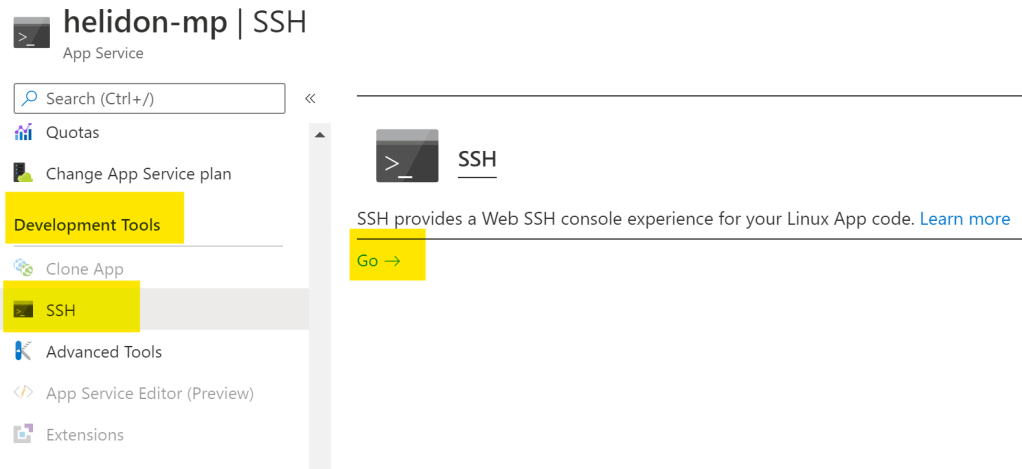 - app.jar, which is renamed from either helidon-quickstart-se.jar or helidon-quickstart-mp.jar, exists in /home/site/wwwroot.