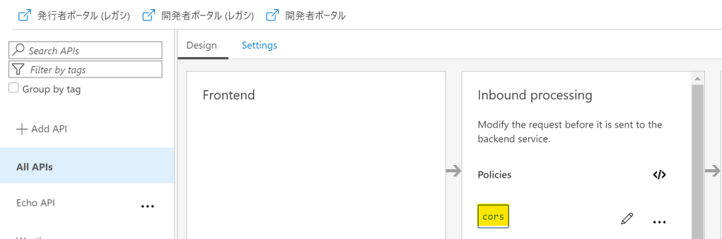 以前開発者ポータルのエントリで、対話コンソールからのAPIテスト呼び出しのためのCORSポリシー適用が可能と書いた。このCORSポリシーはグローバルレベルで設定されている。