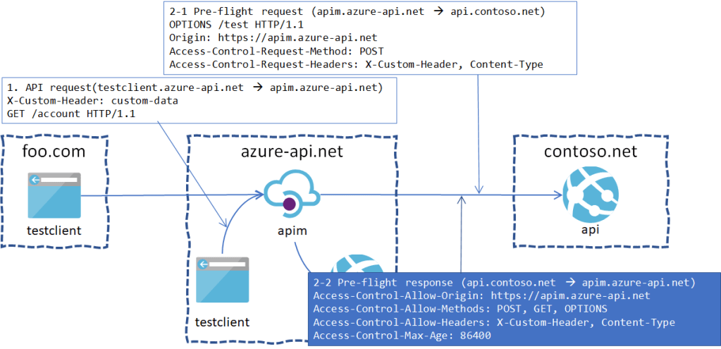 APIMのGatewayは通常、外部サービスとのアクセス、つまりドメイン外のリソースにアクセスするので、CORSが許可されていることを確認するためのPre-flightリクエストの後に実際のバックエンドサービスへのリクエストを投げている。