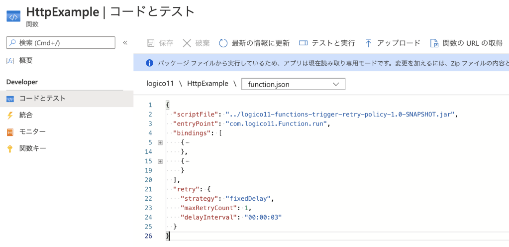 続いてTrigger Retry Policyの設定。今回はTrigger Retry Policyをhost.jsonとfunction.jsonで異なるものを指定し、どちらが優先するか(function.jsonへの指定が優先することはわかっているが)を確認する。まずはhost.jsonに指定。