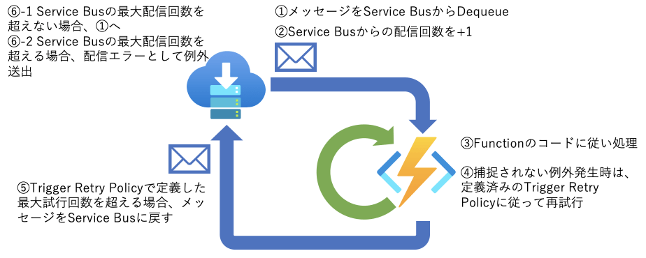 このリトライポリシーは、サービスが持つデフォルトの再試行回数と掛け合わされる点に注意が必要。ドキュメントにもあるが、例えばService Busの場合、デフォルトで10回配信試行するが、Trigger retry policyとして上記の例のように定義していた場合、Service Busからの配信で5×10回の計50回の再試行が発生する。再試行の流れを図示すると以下のような感じ。
