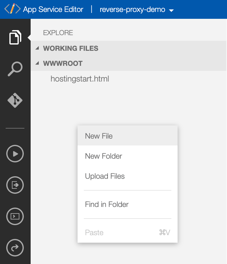 [EXPLORE] の中で右クリックするとメニューが現れるので、[New File]を選択、新規作成するファイルの名前を指定する。ここで作成するファイルは以下の2個。