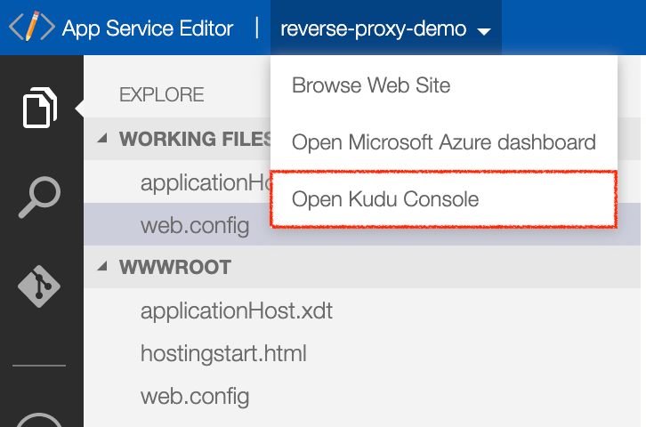 両ファイルを作成したら、App Service名をクリックしてドロップダウンメニューを開き、Open Kudu Consoleを選択する(下図)。