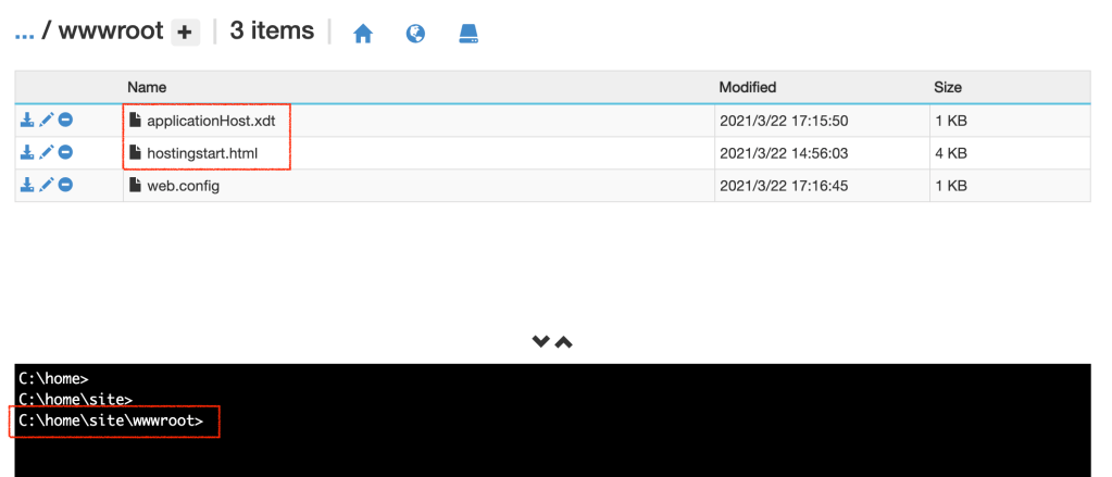 この操作で、Kudu Consoleが開く。site > wwwroot とディレクトリをたどると、先ほど作成した2ファイルが存在することを確認できるはず。