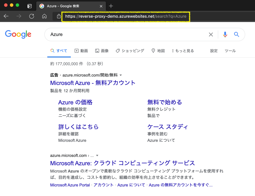 指定したパスもGoogle先生に渡すことができる。例えば、/search?q=Azureを渡すと、以下のような感じ。