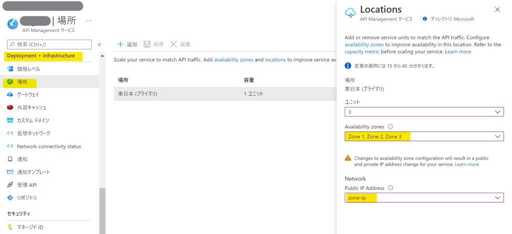Premium SKUでインスタンスを作成し、しばし待つとできあがるので、Deployment & Infrastructureの場所を開く。今回は東日本リージョンで作成したので、東日本をクリックすると、可用性ゾーンの設定ができる。なお、ゾーンの個数だけユニットを増やしておく必要がある。