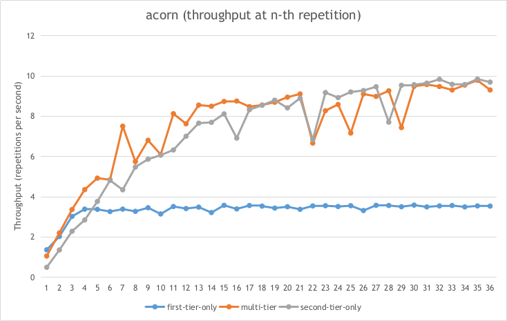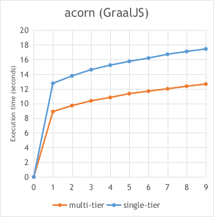 一般に、多層コンパイルによる具体的なパフォーマンスの向上は、プログラムの特性やVMを実行するCPUなど、いくつかの要因に依存するため、状況によって変わります。例えば、acornベンチマークでは、2つのウォームアップカーブの違いはそれほど顕著ではありません。