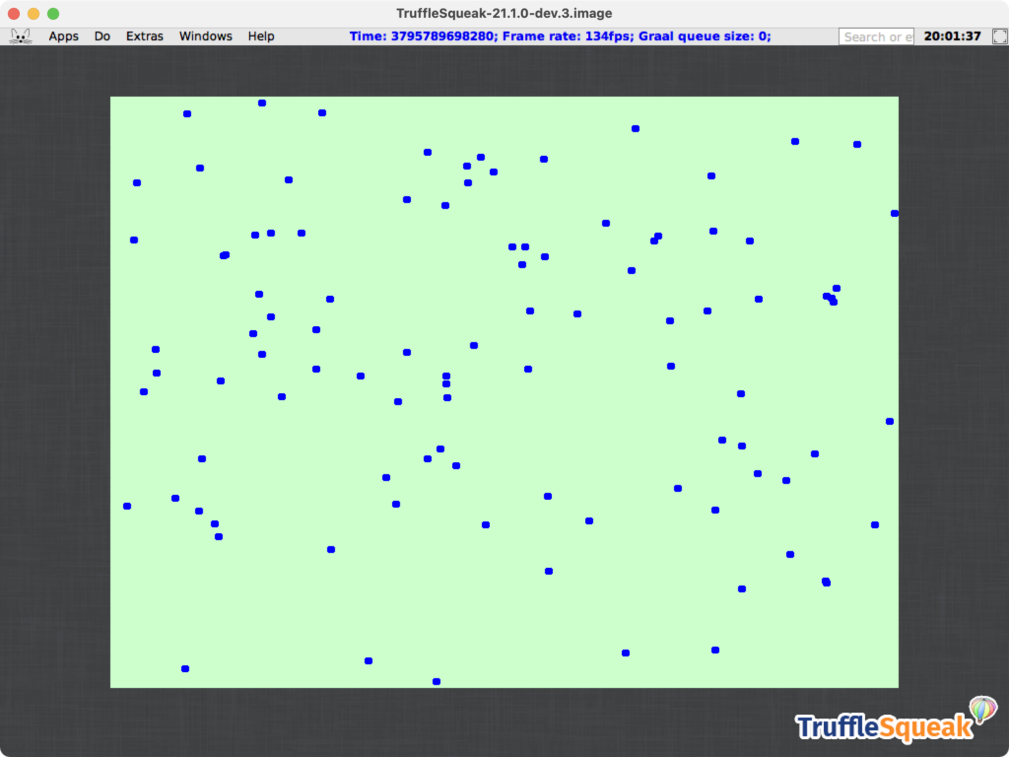 TruffleSqueakは、GraalVMの最新リリースに対応しており、GraalVMチームがGraalVM言語の多層コンパイル機能に取り組んでいることを知り、興奮しました。フィードバックを提供するために、私たちは論文に掲載されたBouncingAtomsMorph UIベンチマークを再実行しました。このベンチマークは、Smalltalk UIフレームワークを温めるためのシンプルなガスタンクシミュレーションです。以下がその様子を示すスクリーンショットです。
