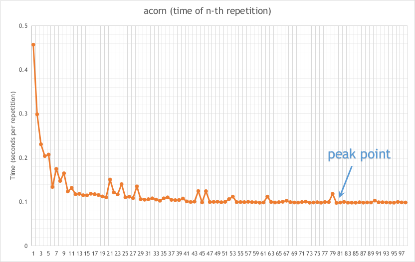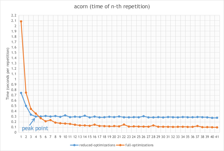 ウォームアップのパフォーマンスには、さまざまな要因があります。これを確認するためには、まず、プログラムが完全に「ウォームアップ」されたこと、言い換えれば、ピークパフォーマンスに達したことの意味を考えてみる必要があります。プログラムがウォームアップが完了した時点を、後続のコンパイルでプログラムの性能がそれ以上向上しないポイントとして定義できます。ここでは、acornベンチマークのピークポイントを、n回目の反復の時間を追跡するウォームアップカーブで示しています(これは、経過時間ウォームアップカーブの微分です)。