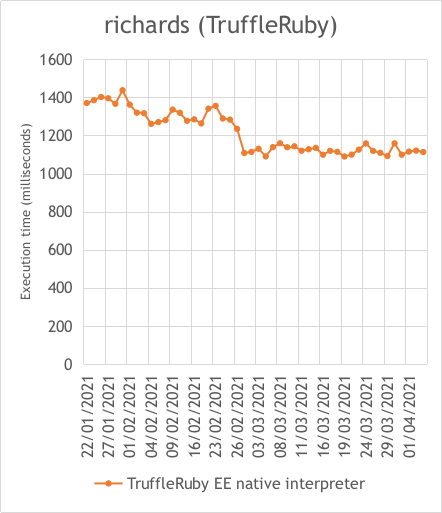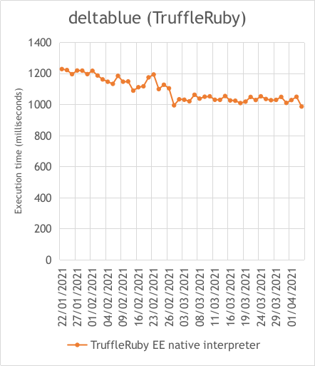 そこで、GraalVMチームはこの数ヶ月間、個々の言語のインタープリタ性能の向上に注力しました。いくつかのベンチマークで、またいくつかのGraalVM言語で、インタプリタのみの実行モードのパフォーマンスを追跡しました。最も顕著な改善はTruffleRubyで行われ、deltablueとrichardsの両ベンチマークで約20-25%の性能向上が見られました。以下のグラフは、2021年1月22日以降の毎日のインタープリター・ベンチマークの実行結果を示しています。