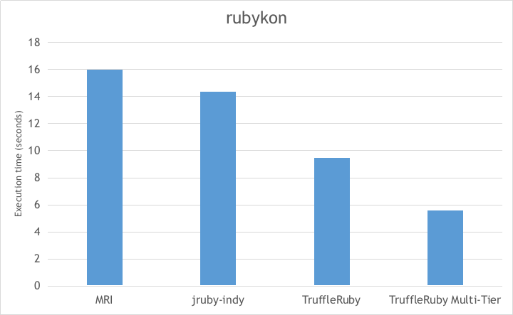多層コンパイルを有効にした TruffleRubyでのone-shotメトリックは、MRI と比較して約 2.75 倍、JRuby と比較して 2.4 倍高速です。