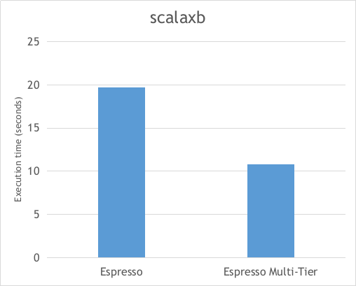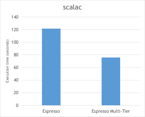 次に、GraalVMのTruffleフレームワークを使用したJavaの実装であるEspressoエンジン上で、Scalabenchスイートからのいくつかのベンチマークの起動を検証します。scalacベンチマークはコードサイズが特に大きく、多層コンパイルによりone-shotの時間が41%削減されました。