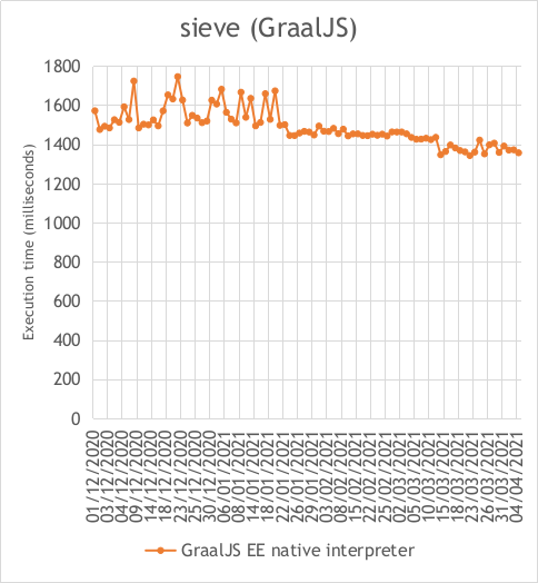 GraalJSでは、インタプリタ性能の向上はTruffle Rubyに比べてやや小さいですが、それでも目立っています。以下のグラフは2020年12月以後でのSieve-of-Eratosthenesベンチマークのパフォーマンスの変化を示したものです。