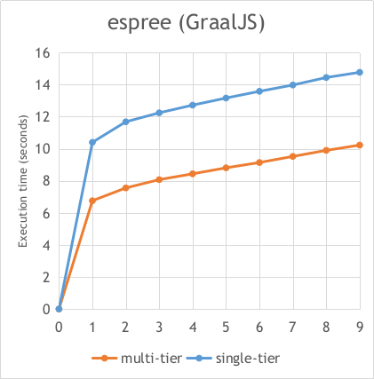 コードサイズがかなり大きい他のいくつかのベンチマークでもこの実験を実施できます。espreeとesprimaの両ベンチマークでは、2回の実行時のウォームアップカーブの傾きは大きく広がっていません。これは、これらのベンチマークでは、(初期遅延の後)単層コンパイルでの実行が比較的早くピーク性能に到達することを示しており、さらにこれらのベンチマークはbabelよりもコード量が少ないことを意味しています。しかし、多層コンパイルでの実行は1回目の反復ですでに先行しており、絶対的な時間差はその後も変わりません。