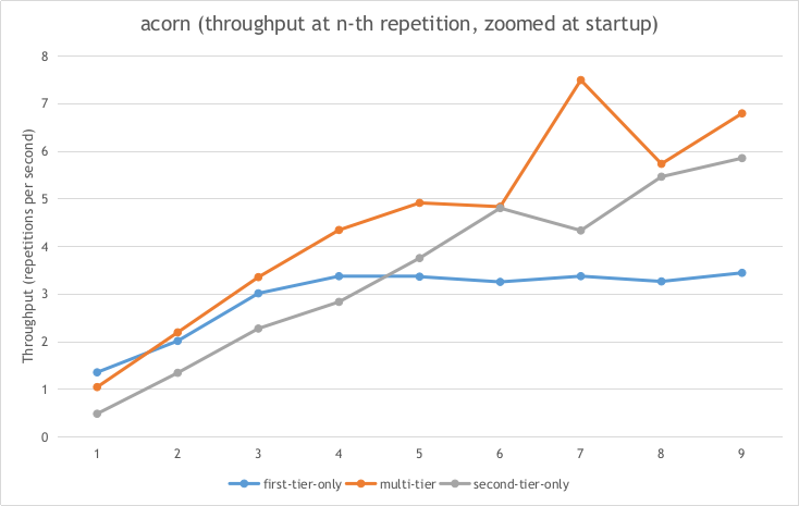 スループットのウォームアップカーブは、一般に経過時間のカーブよりも少しデコボコしていますが、これは各ポイントが現在の繰り返しの速度を表しており、それが変化する可能性があるためです。ここでは、最初の9回の繰り返しを拡大しています。多層モードでの曲線の凸凹の一部は、第1層でコンパイルされたコードの最適化が解除され、第2層でコンパイルされたコードに置き換えられたことによるものです。それにもかかわらず、特に初期の段階では、多層アプローチがより速くピークに達することがわかります。