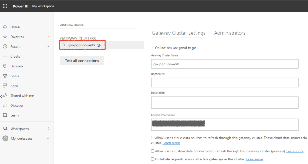 [Manage gateways](ゲートウェイの管理)をクリックすると、以下のような画面が開くので、関連付けたOn premise Data Gateway(この例ではgw-pgql-powerbi)が存在することを確認する。