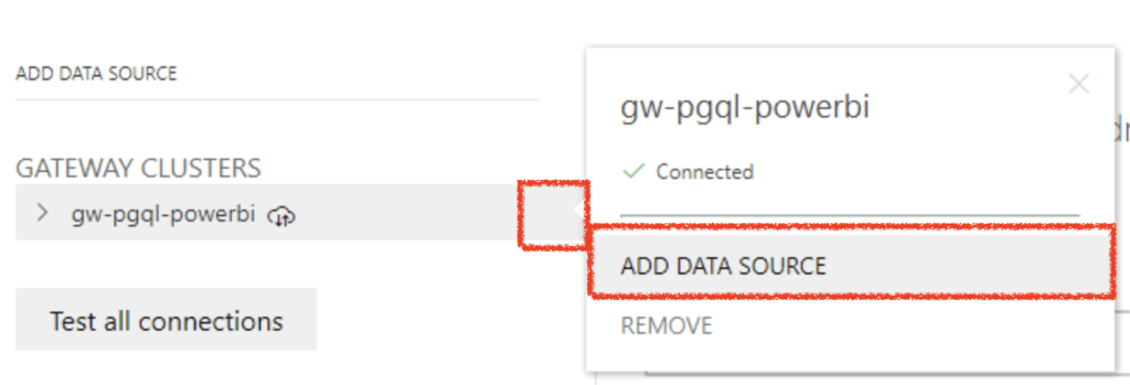 - On premise Data Gatewayの右側にメニューをクリックできる・・・が現れるので、これをクリック