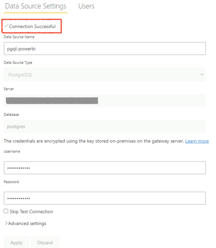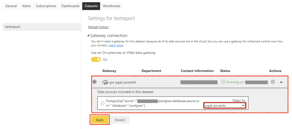 Gateway connection(ゲートウェイ接続)の設定画面で、接続したいGatewayを選択し、接続したいDatabaseとのマッピングを構成して、Apply(適用)をクリック。これでGatewayを経由してPower BI Serviceからデータを取得できるようになる。以下の例はNpgsqlで接続するOn premise Data Gatewayの例。