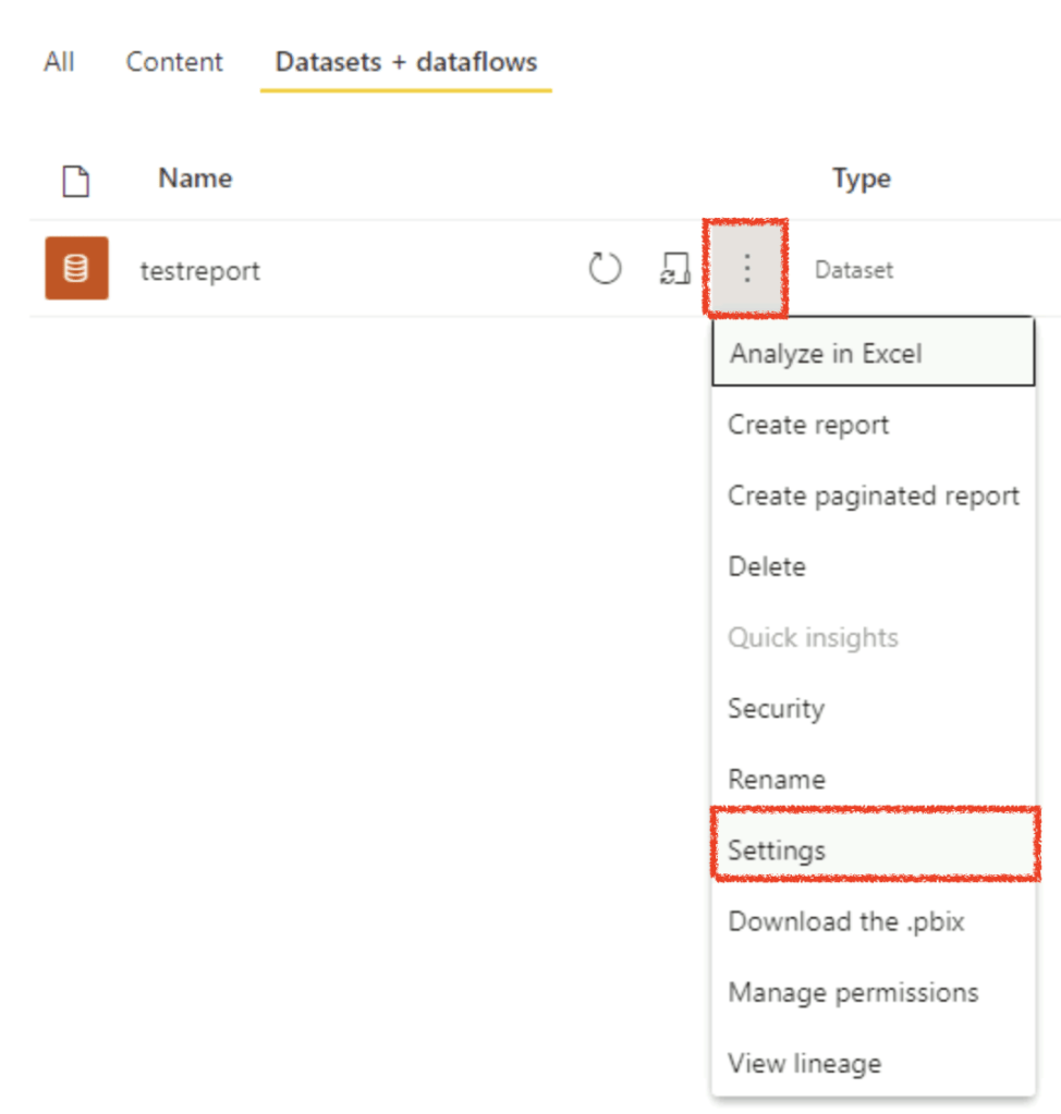 最後に、発行済みレポートのデータセットをワークスペースから選択して、On premise Data Gatewayと関連付ける。この例では、以下のtestreportというデータセットを対象に構成する。メニューから[Settings](設定)をクリックして構成画面を開く。