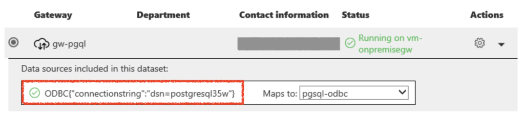 - On premise Data Gatewayが稼働するノードで構成したODBCデータソースの接続文字列を指定する。例えば、DSNがPostgreSQL35Wの場合、接続文字列は以下の形式。
