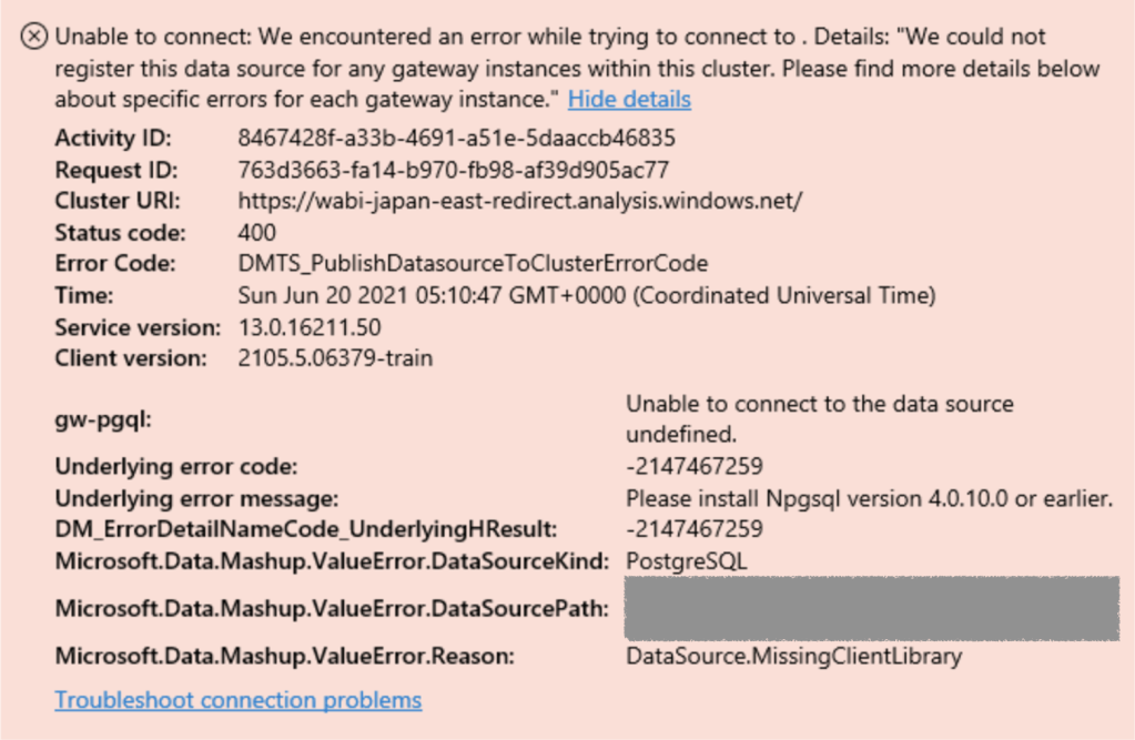 - インストールするNpgsqlは.NETランタイムとの関係で、4.0.10以下でなければならない(2021/06/20現在)。これを上回るバージョンでは、On premise Data Gatewayで接続に失敗する(下図のようなエラー表示を確認できる)。