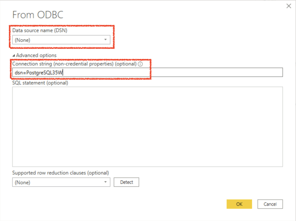 ODBC接続の場合、通常はDirectQueryを選択できない。これはpsqlODBCの場合も同様である。(この記事のように、一部のODBCドライバーはDirectQueryに対応しているものもある)。ODBCを選択後(下図左)、データソース名を指定する。Pull Downに現れるものを使っても、接続文字列の欄にdsn=で定義してもよい(下図右)。