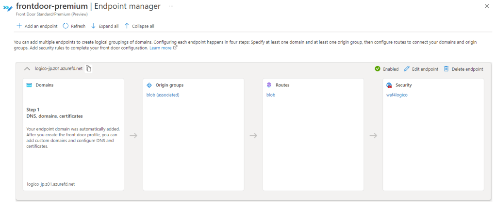2022/03/30に一般提供を開始したFront Door Premiumでは、GA版のFront DoorとはPortal上の設定が少々異なっている。以下はStorage (Blob) だけを構成した例。