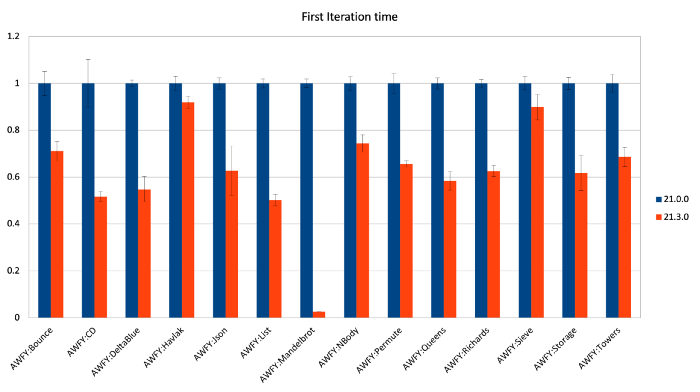 本リリースの Java on Truffle では、ゲストとホストの両方で Java 17 をサポートしています。また、起動時のパフォーマンスも大幅に改善されています。例として、いくつかの有名なベンチマークの最初の反復にかかる時間を 21.0.0 と 21.3.0 で比較してみます(最初の反復時間を測定しているため、低い方が良い結果です)。