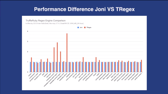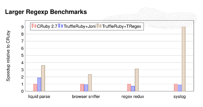 TRegexをデフォルトで使用することで、TruffleRubyは正規表現のマッチングを大幅に高速化できます。TRegexを使ったTruffleRubyでは、大きな正規表現のベンチマークで最大9倍の速度が出ていることがわかります。