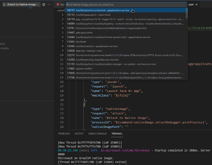 launch.jsonファイルの設定補完から“Native Image: Attach to Process”を選択します。これにより”Attach to Native Image”の構成を生成します。この構成を選択して実行すると、実行プロセスのリストが現れますので、ネイティブ実行ファイルに対応するものを選択してください。