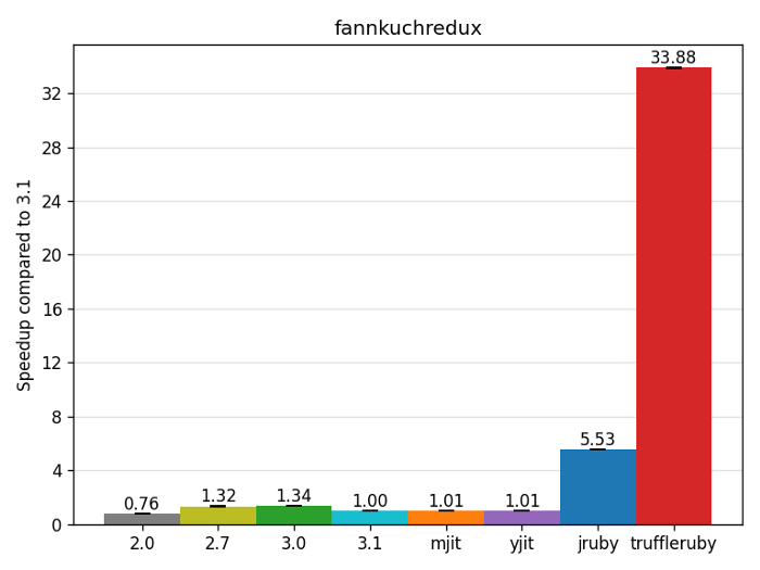 今回の実行では、3.1MJITはCRuby 2.0のちょうど3.0倍高速でした。TruffleRubyはこのベンチマークが出たときから得意なことがわかっていて、今回の計測ではCRuby 2.0に対して10.4倍高速でした。