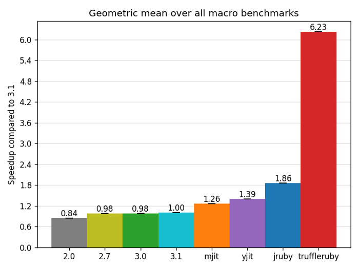 - TruffleRubyは単に他のRuby実装に比べて別格で、幾何平均で全体で6.23倍の速度向上がある
