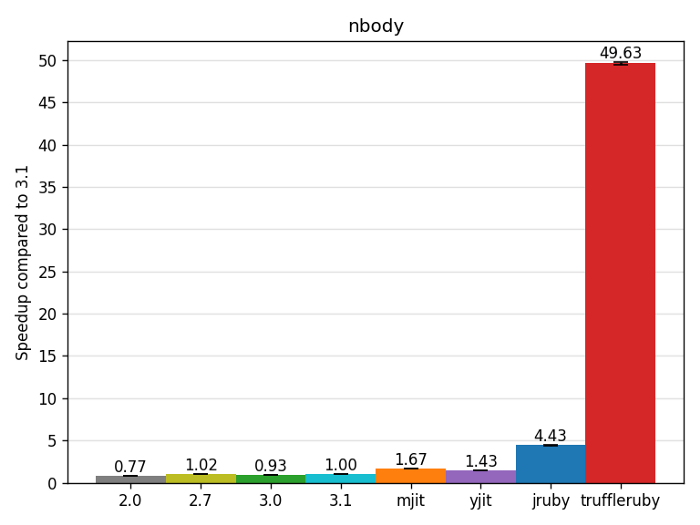このベンチマークは主に算術計算とインスタンス変数へのアクセスで構成されています(惑星をオブジェクトとして表現しています)。JRubyは4.43倍という良好な高速化を達成しました。TruffleRubyはCRuby 3.1の約50倍の速度で、これは単純にすごいことです。