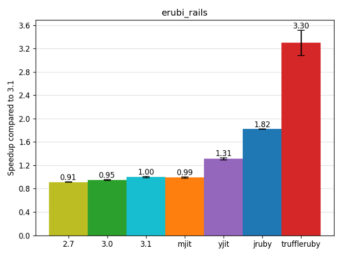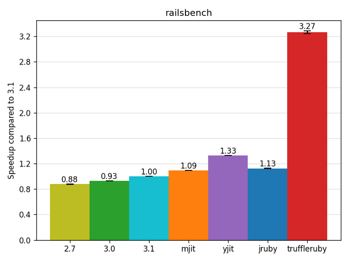 つまり、この小さなRailsベンチマークでは、TruffleRubyの応答時間はCRuby 3.1の3倍以上も速いのです。