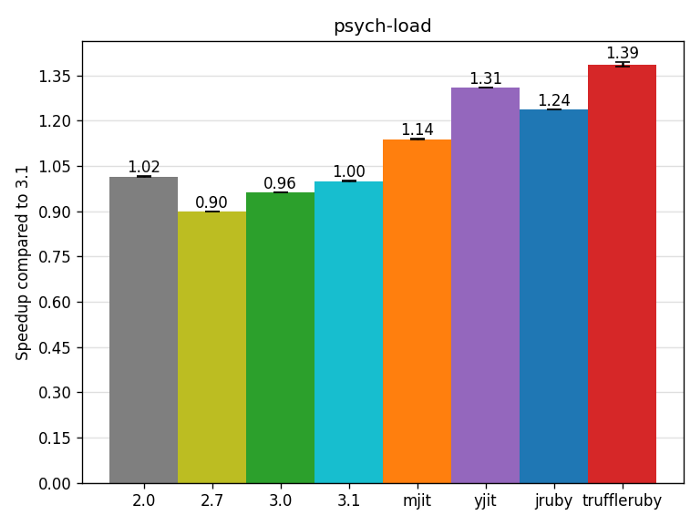 CRuby 2.0ではPsych 4.0.1ではなくPsych 2.2.4が使用されていますが、これはPsych 2.0互換の最新版であるためです。ベンチマークのかなりの部分は、psych C拡張(libyaml YAMLパーサーを使用)内で費やされていると思われますが、MJITとYJITがここでいくつかのスピードアップを示すように、C拡張(CRuby JITが役に立たない)だけでなくRubyコードでも時間を費やしていることが分かります。