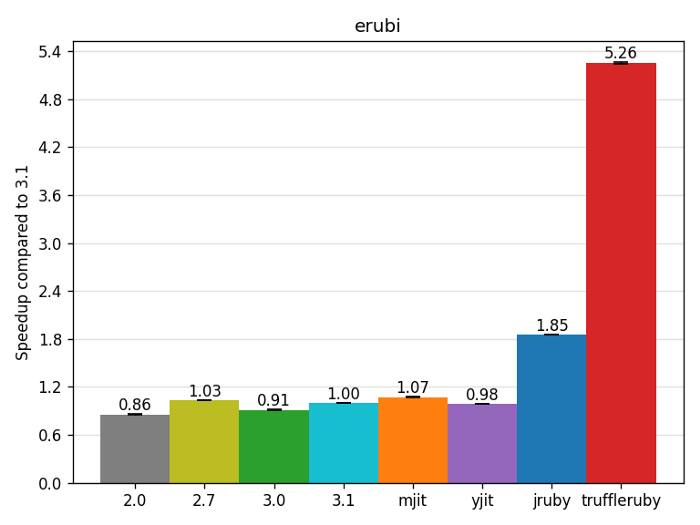 レンダリングされたテンプレートの長さは166563バイトです。TruffleRubyはStringの連結が非常に効率的であるため、この処理で素晴らしいパフォーマンスを発揮し、5.26倍のスピードアップを達成しました。