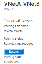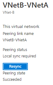 ピアリング名(今回の場合だとVNetB-VNetA)をクリックすると左図のような画面が現れるので、Resync(再同期)をクリックすると、リモート同期後ローカル同期が走る。そのため、ローカル同期を実行すると、リモート同期は明示的に実施しなくてもよい。
