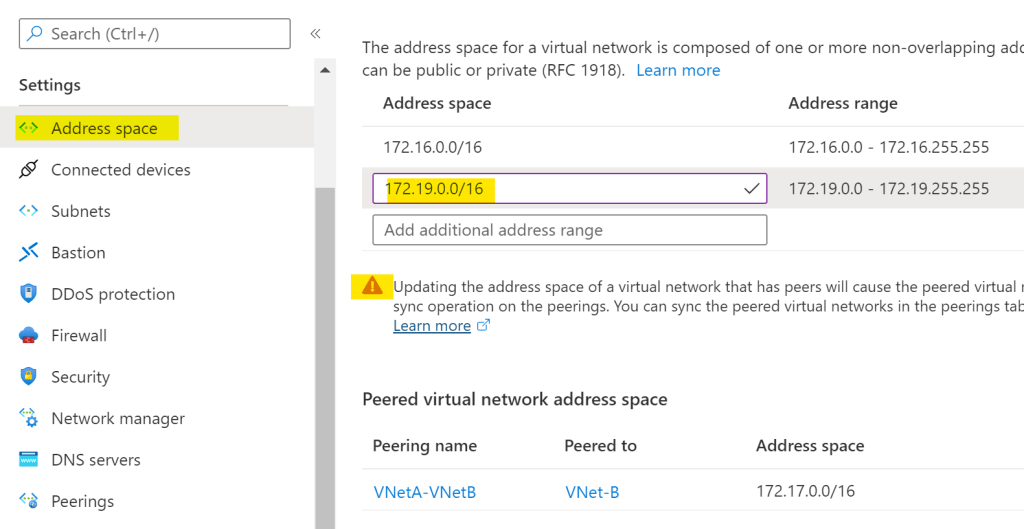 Updating the address space of a virtual network that has peers will cause the peered virtual networks to not be able to connect to this new address space until you perform a sync operation on the peerings. You can sync the peered virtual networks in the peerings tab, but requires you have contributor permissions on the peered virtual networks.