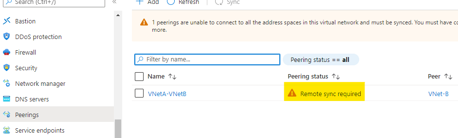 (2) Azure PortalのVNetのページ > Settings (設定) > Peerings (ピアリング) を開いて同期する。この同期はリモート同期(VNet-AからVNet-Bへの同期)、ローカル同期(VNet-Bでの同期)の2種類ある。下図はVNet-Aから見た場合。