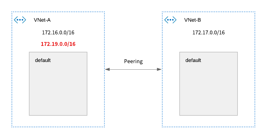 すでに172.16/16と172.17/16のアドレス空間は設定済みで、ピアリング済みという以下のようなテスト用VNetを用意した。この状態から、172.19/16を追加する。