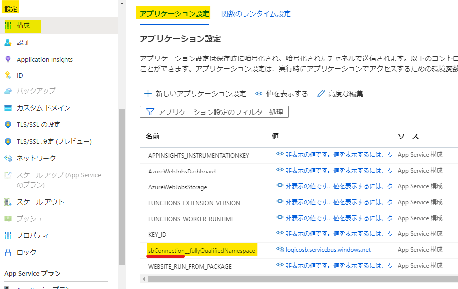 具体的には、sbConnection__fullyQualifiedNamespaceのsbConnectionが上記connectionの値として設定されているので、これを使い取り扱うService Bus名前空間を識別している。