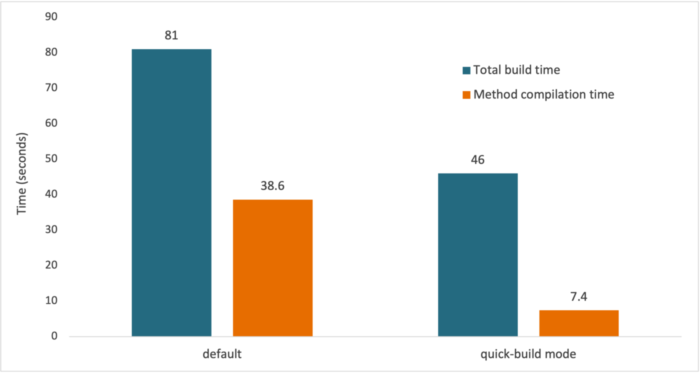 クイックビルドモードは、ランタイムパフォーマンスとメモリ使用量を犠牲にしてビルド時間を最適化するため、開発目的でのみ推奨していることに注意してください。本番環境での実行には、実行時のパフォーマンスとメモリ使用量を最適化するデフォルトのコンパイルモードを使用してください。