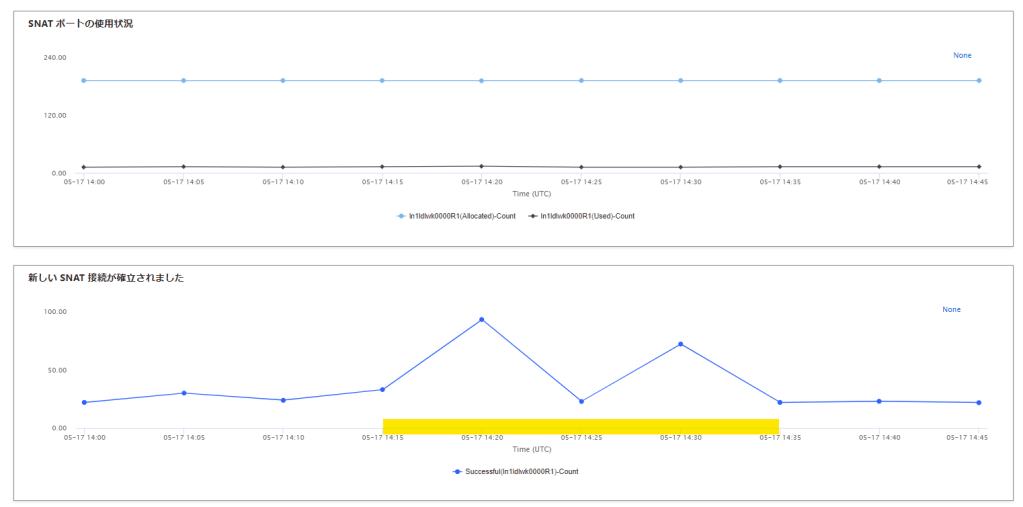 もう一つの方法はHTTP/2を使う、というもの。HTTP/2であれば同一ピアに対する通信の場合、1個のTCP接続だけで複数の通信を多重化できるため、SNAT Port枯渇にはなりづらい。もちろん、1対多の通信が発生する場合にはこの限りではないが、対向のAPIとの通信でHTTP/2が利用できるなら、回避策の一つとして検討の価値がある。以下はAzure PortalでSNAT Portの枯渇状況を確認したもの。黄色でマークした時間帯にHTTP/2で他のAPIを呼び出す負荷テストを実行したのだが、接続は増えているものの、SNAT Portの枯渇は発生していないことがわかる。